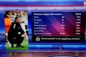 体育资讯9月22日讯 英超第5轮比赛,纽卡客场0-0战平伯恩茅斯。据BBC统计,纽卡本赛季多项进攻数据排名英超后几位。