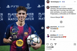 赛后,费尔明在个人INS上晒出了自己与当场最佳球员的奖杯合影,并写道: