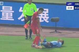 体育资讯10月25日讯 河南vs浙江第23分钟,张瑷晖倒地夹住皮球,王上源上去对着皮球一通踢。