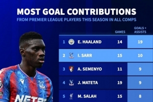 体育资讯11月7日讯 德国转会市场统计了英超球员本赛季各赛事的参与进球数量,并列出榜单,哈兰德参与19球居首,萨尔参与10球次席。