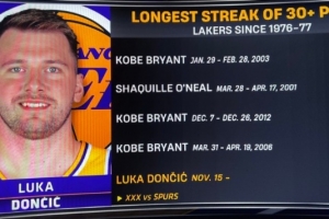 这是东契奇在湖人连续第9场砍30+,自1976-77赛季以来湖人队史第四长,仅次于科比(16场、10场、9场)和奥尼尔(11场)。